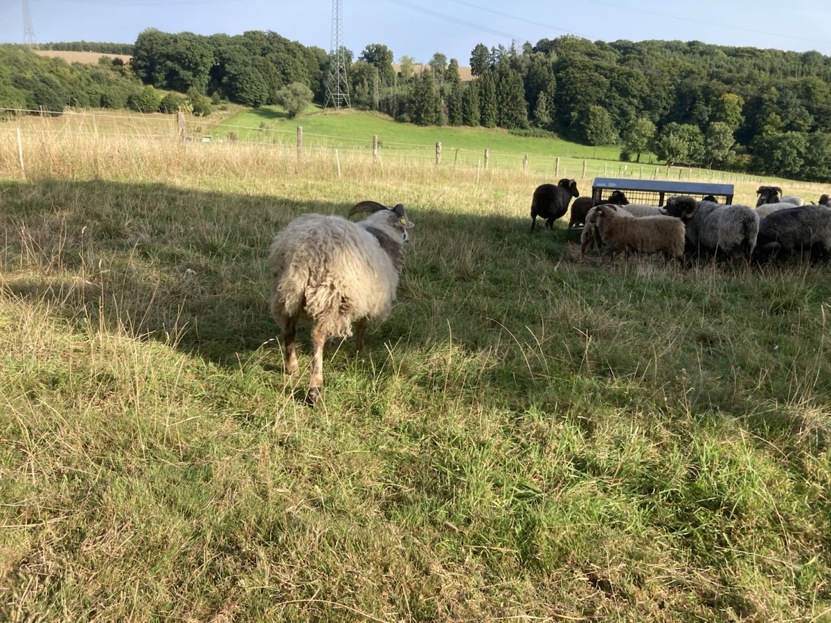 Heute waren die Damen sehr lange auf der anderen Annette- Wiese. Es hat ihnen da soooo gut gefallen, dass sie bis in die letzte Ecke gezogen sind, dass die das Einfüllen der Leckerchen und das Hupen nicht hören konnten – oder wollten. Also habe ich, während Micha Wasser und Leckerchen verteilt hat, mich auf die Suche nach den Damen begeben, um sie abzuholen…