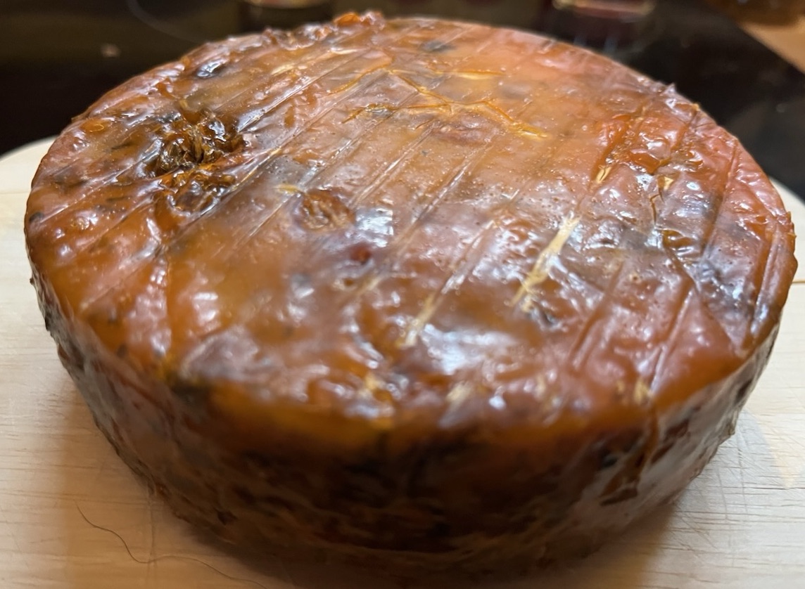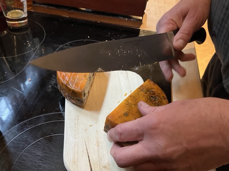 Mein Käse war zu nass und so trocknete das Coating nicht, aber die Geduld gewann und der Käse trocknete, halb eingeschmiert… als er endlich trocken war, habe ich ihn überall sorgfältig eingeschmiert und so lag er nun ca. 4 Wochen im Kühlschrank… bis gerade …