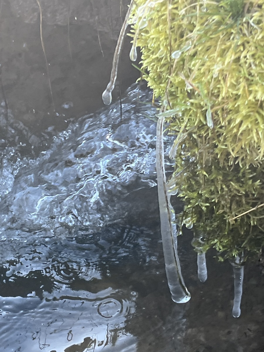 Es war heute Nacht wieder richtig kalt, am Bach fanden wir kleine Eisgebilde